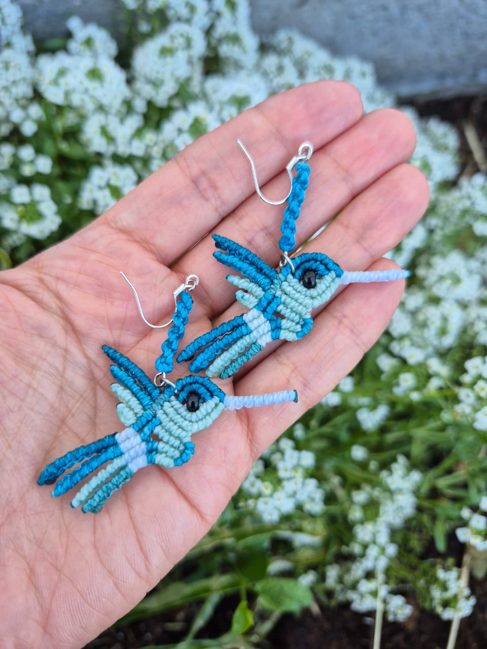 Aritos de macramé colibrí colores ganchos de plata 925