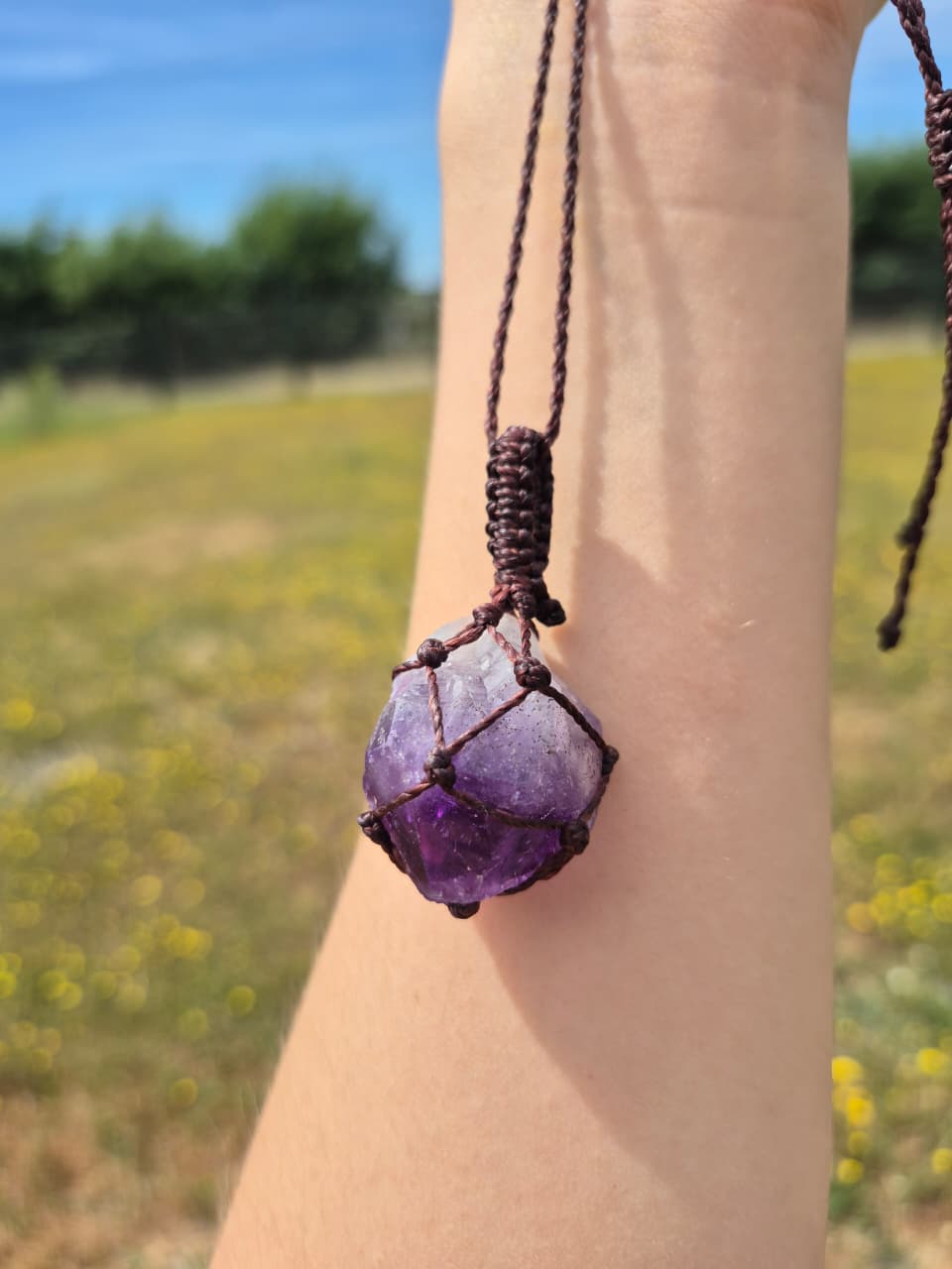 Collar artesanal que combina la belleza natural de la amatista en bruto con técnica de macramé tejido a mano. Diseño versátil con cierre regulable que se adapta a diferentes largos, permitiendo múltiples formas de uso. La amatista, piedra de poder ancestral, se presenta en su estado bruto, resaltando su autenticidad y energía mineral. Pieza única que refleja la maestría artesanal y la conexión con elementos naturales, ideal para quienes valoran la calidad y el significado en sus accesorios.