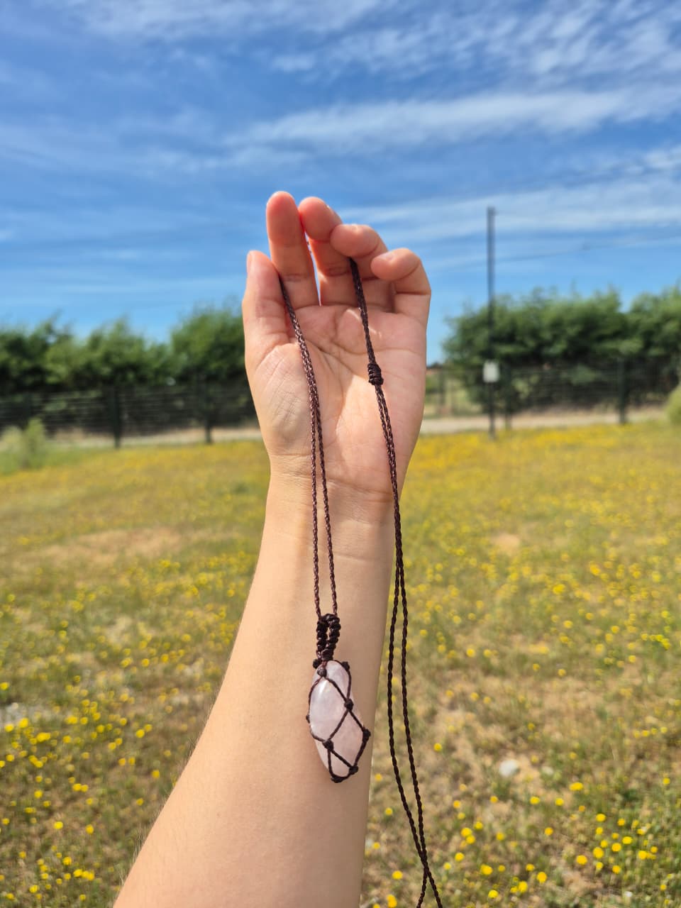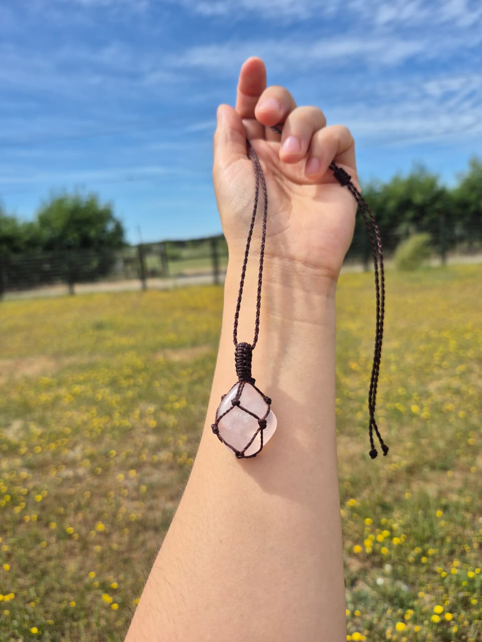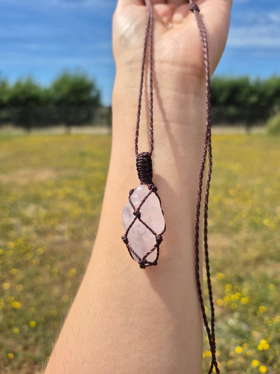 Collar de cuarzo rosa pulido macramé
