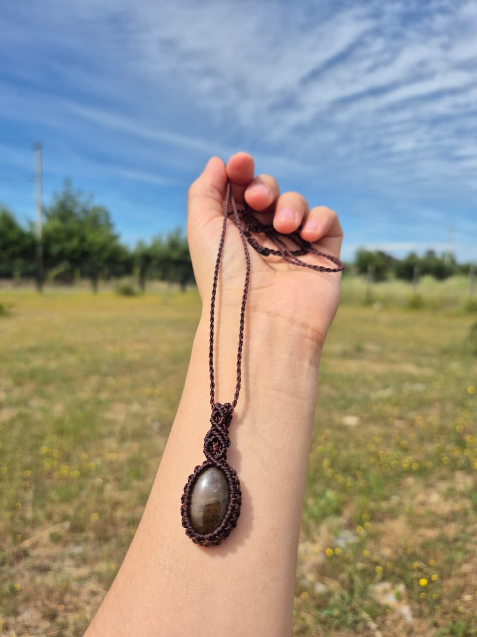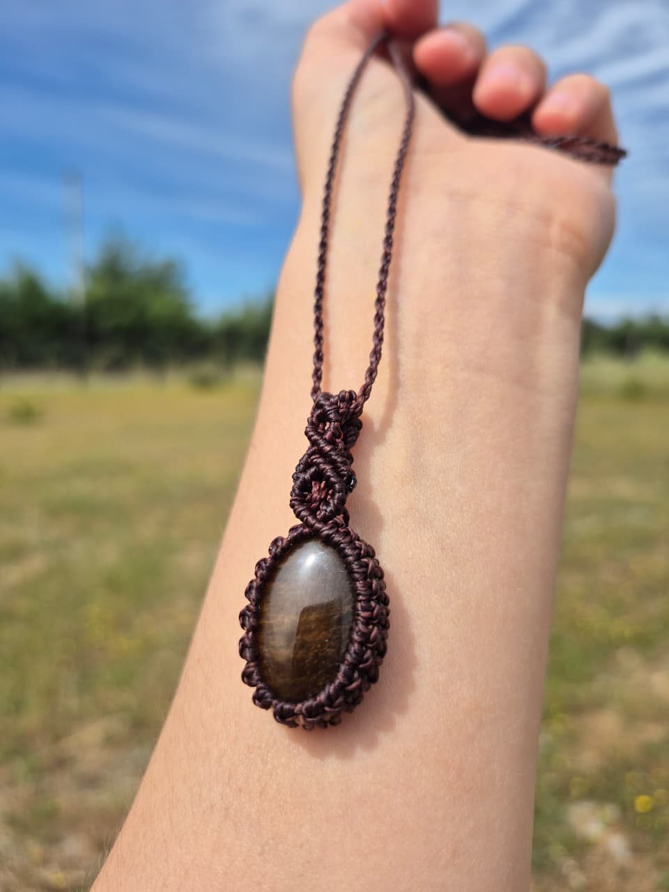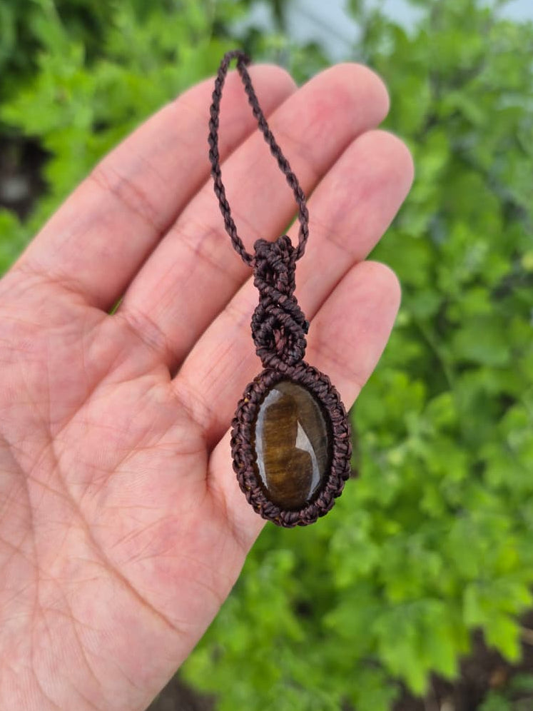Collar artesanal tejido en macramé que combina técnica tradicional con diseño contemporáneo. Presenta un cabuchón de ojo de tigre como pieza central, capturada en una montura delicada que resalta sus tonalidades naturales. El cordaje regulable permite ajustar la longitud según tus preferencias, garantizando comodidad y versatilidad. Ideal para quienes aprecian piezas únicas que fusionan artesanía y elegancia en cada detalle.