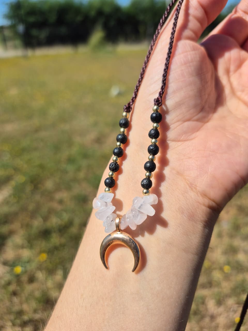 Collar artesanal elaborado en macramé con piedra de cuarzo rosa, complementado por un delicado dije de luna y piedra volcánica. Diseño regulable que se adapta a diferentes largos, permitiendo versatilidad en su uso. Cada pieza es confeccionada manualmente, reflejando la dedicación y maestría del trabajo artesano. El cuarzo rosa, conocido por sus propiedades energéticas, se combina armónicamente con la piedra volcánica, creando una joya única que trasciende lo meramente decorativo. Ideal para quienes aprecian la autenticidad y la belleza de lo hecho a mano.