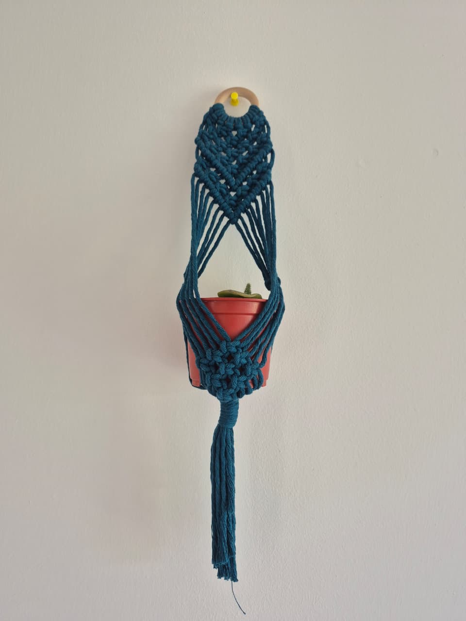 Este cuelga para plantas pequeño, elaborado a mano con macramé, aporta un toque elegante y artesanal a cualquier espacio. Su diseño delicado y tamaño compacto permiten exhibir tus plantas favoritas con estilo, integrándose armoniosamente en ambientes modernos o clásicos. Perfecto para quienes valoran detalles únicos y sofisticados en la decoración del hogar.