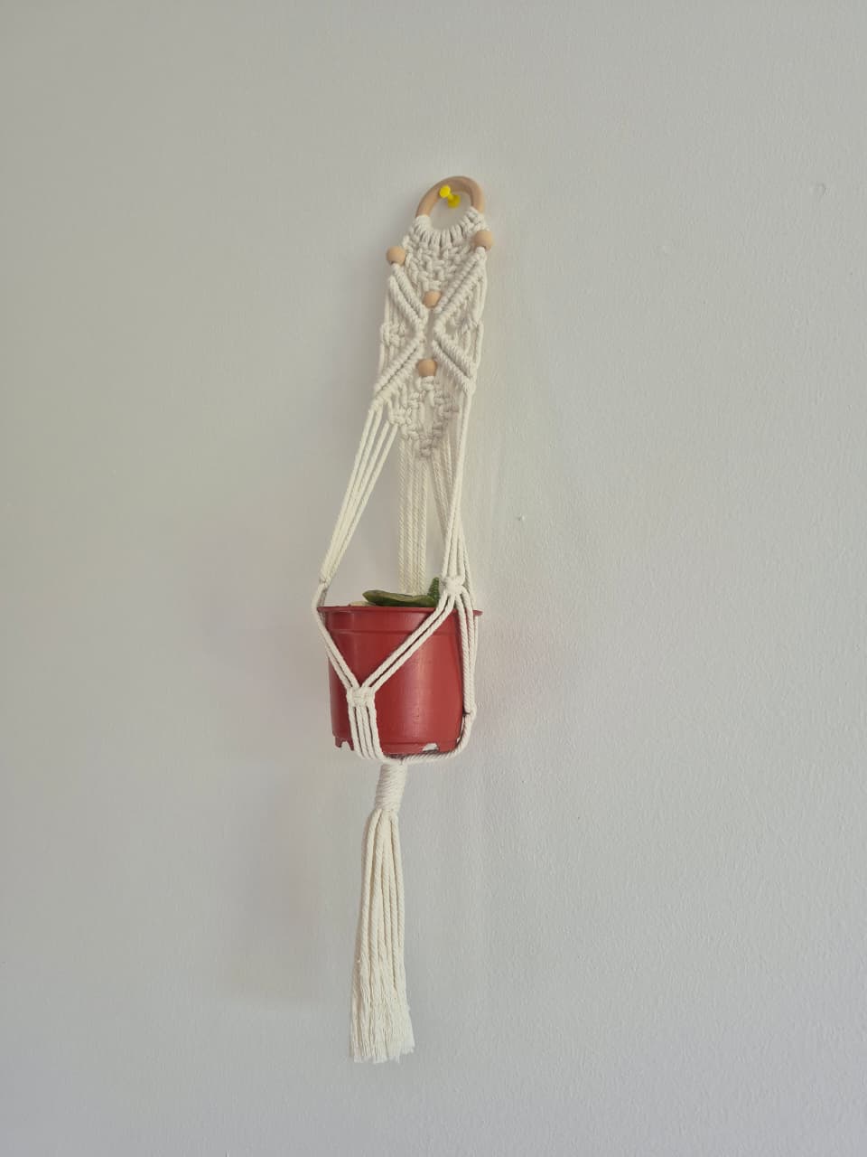 Este cuelga para plantas pequeño en color crudo, elaborado a mano con técnica de macramé, aporta un toque elegante y natural a cualquier espacio. Su diseño delicado y sostenible realza la belleza de tus plantas, convirtiéndolo en un accesorio sofisticado que combina funcionalidad y estética artesanal. Ideal para quienes buscan una decoración con estilo discreto y auténtico.