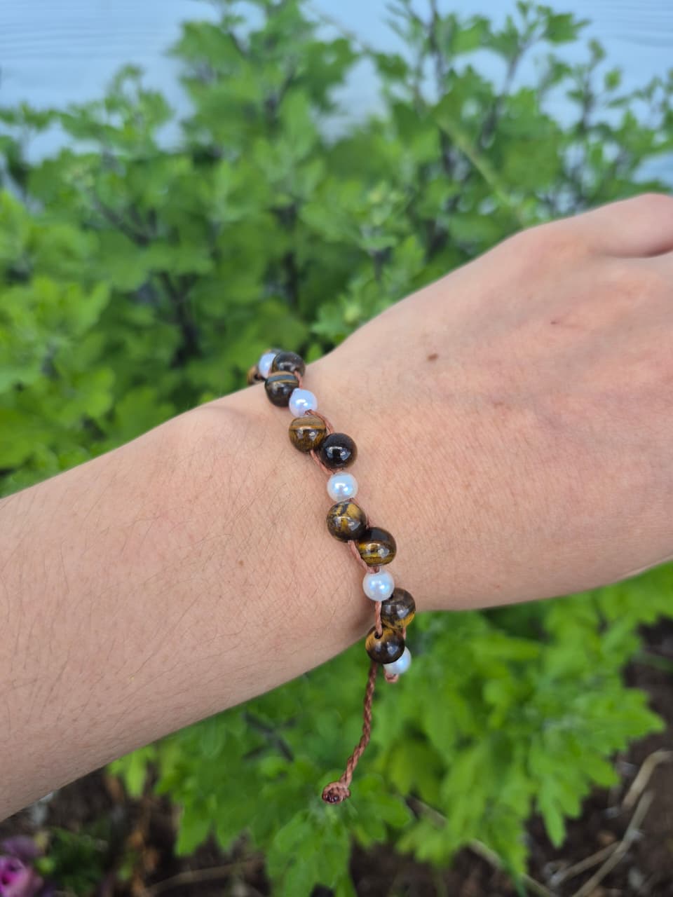 Pulsera de macramé con piedra natural ojo de tigre bolitas