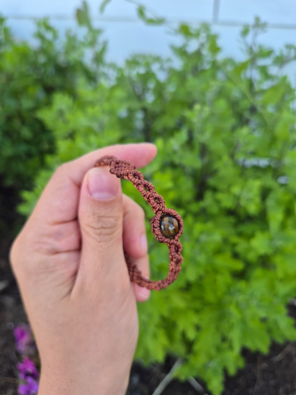 Pulsera artesanal tejida en macramé con piedra natural de ojo de tigre en tonos café. Diseño ajustable que se adapta a diferentes tamaños de muñeca, combinando técnica tradicional con elegancia contemporánea. Cada pieza es única, elaborada a mano con cuidado y precisión. La piedra ojo de tigre aporta carácter y autenticidad a tu estilo personal.